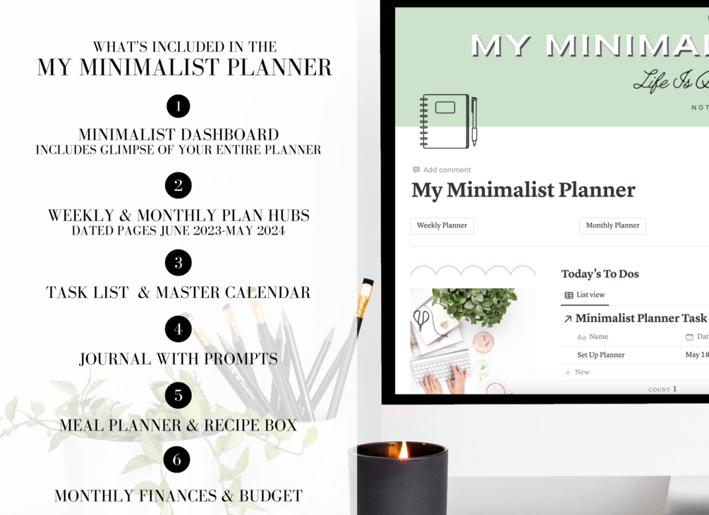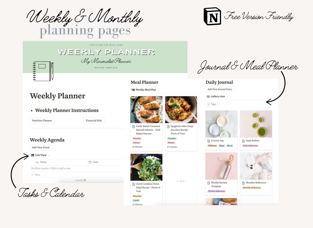 A minimal version of the Ultimate Planner consisting of few pages, databases, and more to keep you organized in our most minimal planner. Includes a dashboard giving you a glimpse at your planner, weekly, monthly, and yearly planning pages, nutrition hub, task list, brain download, financial hub, and journal.