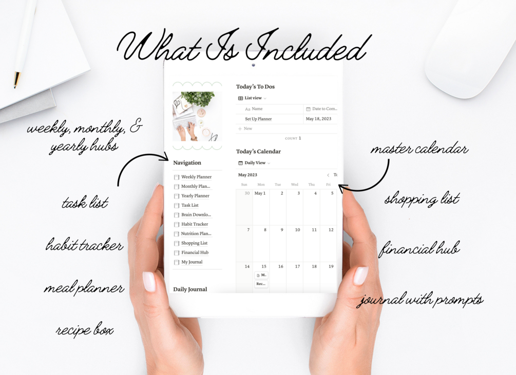 Master calendar, task list, brain download, journal, dated daily pages June 2023- May 2024, meal planner, and journal.
